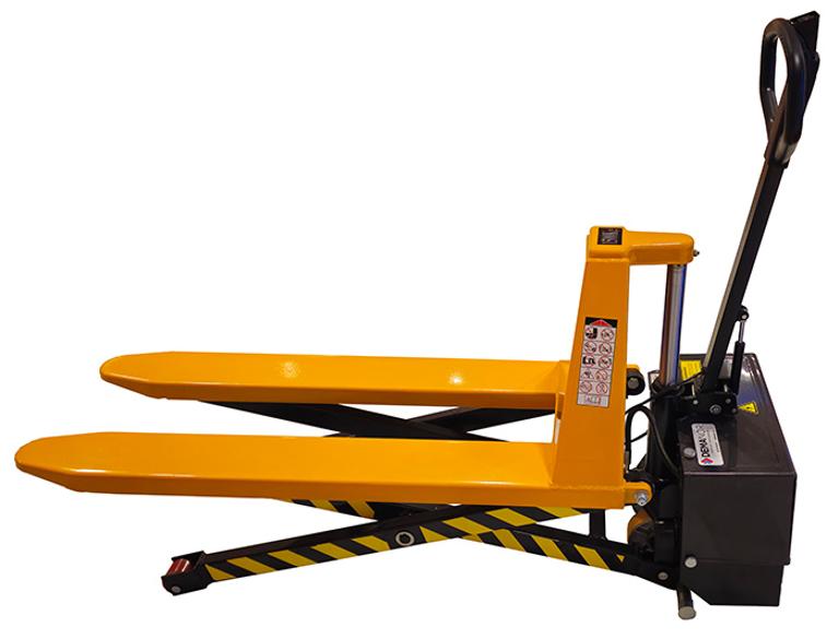 Manuell jekketralle med elektrisk løftefunksjon for håndtering av standard Europall. Leveres med 200 mm styrehjul og boggie.